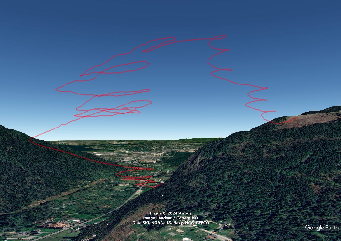 Update: This Wednesday (5/1) I flew in thermals and climbed to nearly 3000’, setting a new personal record. The altitude didn’t bother me but the air was active, and I had some white-knuckle moments as the glider pitched to and fro. Additional exposure to these kind of conditions, plus training, will help me grow more comfortable and control the glider with confidence and calm. Onward!
